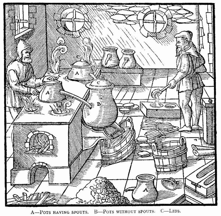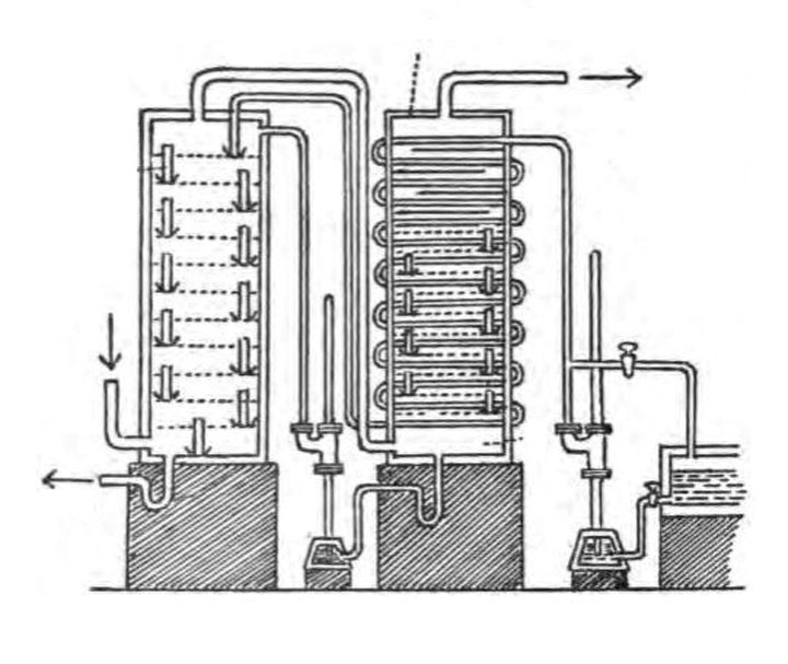De re metallica describes the distillation of silver and nitric acid. However, it was the demand for alcoholic liquor which promoted the development of this unit operation on increasing scales. In 1822 a column still was introduced in Ireland, and it was an improved version of this by Aeneas Coffey which was the basis for the columns used for the early American oil industry.