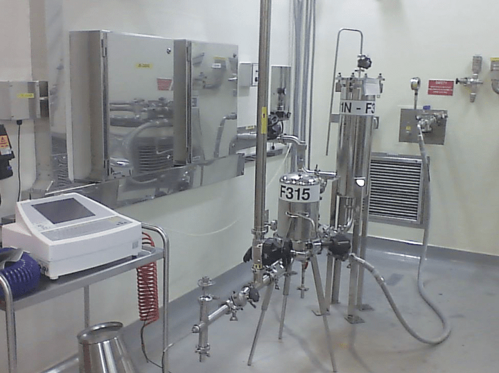 Once a filter had been sterilised it was not possible to confirm integrity of the filter without exposing the sterile side of the filter to the room environment. So we were tasked with improving the sterility of the process, introducing dual sterile filtration, integrating the filter integrity testing, automating as much of the operation as we could, minimising the amount of equipment within the clean room, and retrofitting a new unit into an existing, congested, building – an interesting challenge!