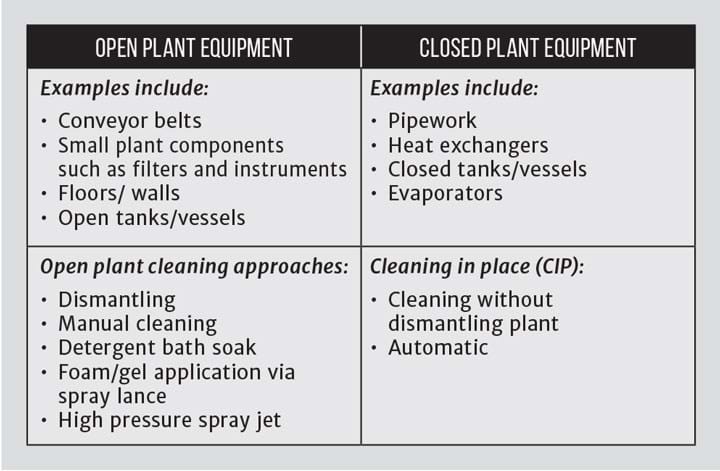 Approaches to cleaning will depend on the type of equipment, whether open or closed, and particularly the ease of access to the product contact surfaces (see Table 1).