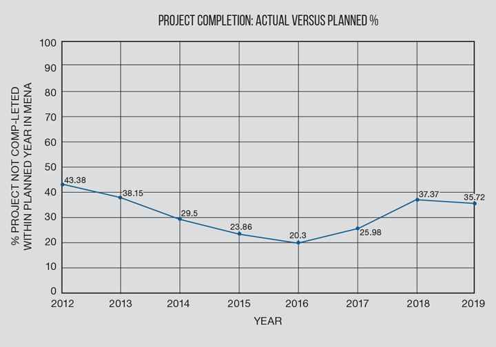 MEED is a leading Middle East and North Africa (MENA) business intelligence tool providing news, analysis and insight into regional markets, projects, tenders and government policy. Its analytics show that the percentage of actual project completion within a given year versus planned completion dates is running around 40%, meaning 60% of projects planned to be completed in MENA within 2019 will not be. This trend, as can be seen in Figure 1, has been consistent since 2012.