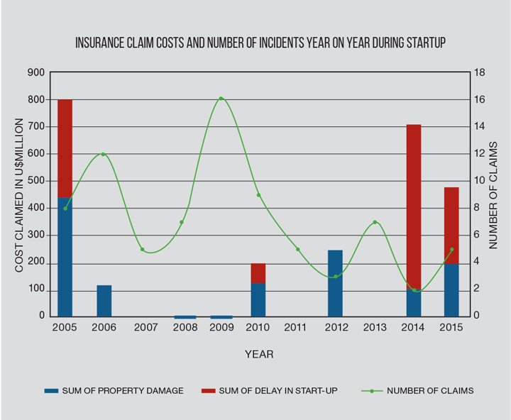 We turned to insurance and risk management company Marsh to provide data of losses that have occurred during commissioning and startup which resulted in claims to the underwriter market. Its database revealed significant losses which are a combination of the damage to property as a result of an incident and the consequential cost in lost gross profit due to the delay in startup.