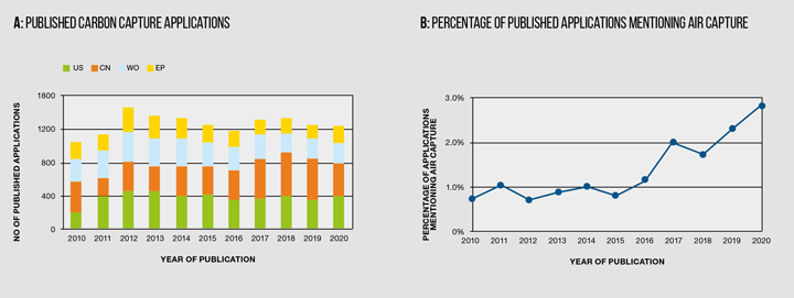 A good way to monitor commercially relevant research and development is to study the trends in patent applications published in a particular technological field. Figure 1a shows the number of patent applications directed to carbon capture technology published over the last 10 years. This graph suggests that the number of new advances year-on-year in CCS has remained relatively consistent.