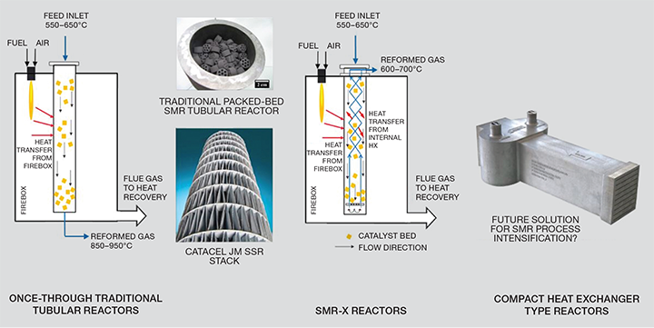 The process is often thought of as a ‘big steam boiler’, because heat is produced in excess and the excess heat is used to produce steam. This is a result of the high temperatures (up to 890°C in reforming reactors) required to meet high methane conversion at typical operating pressure (20–30 bar). Only part of the steam produced is used by the process itself. The excess steam must be recovered economically and is generally exported to other, nearby users. In such cases, hydrogen is affordable. In other cases where steam is plentiful, it is so cheap that it can’t be recovered economically. The second reason to improve the SMR process is to produce less (or zero) excess steam.