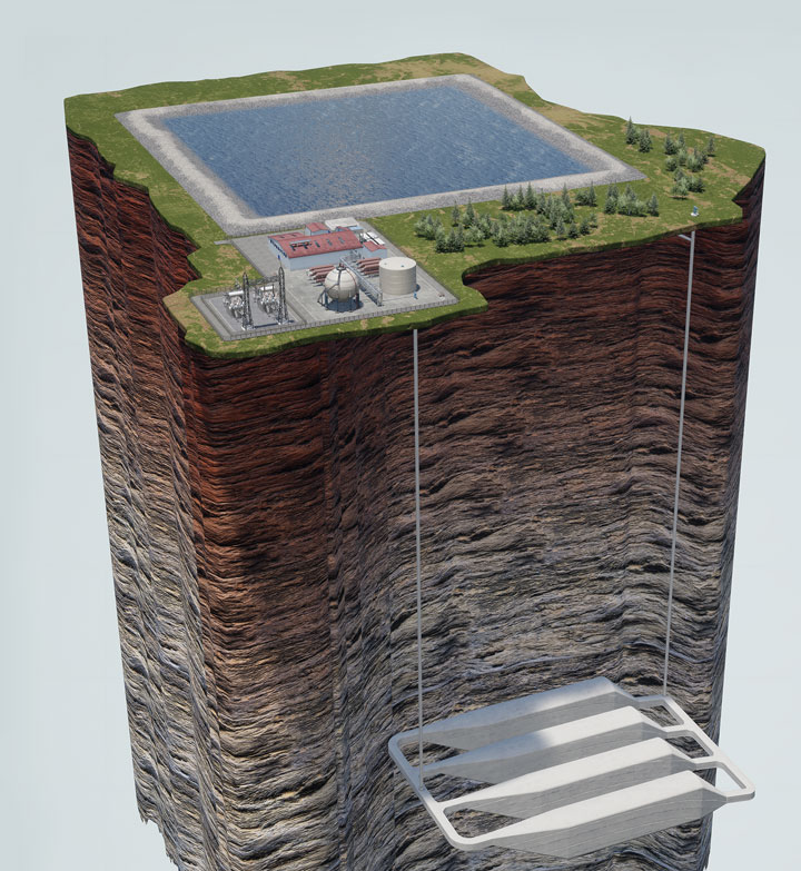 The cooled, pressurised air is then sent underground into the cavern and stored for later use.