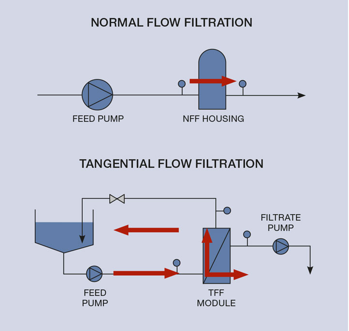 Tangential flow filtration (TFF) systems are well suited to this application. TFF systems use a size exclusion process with flow directed tangentially over the filter, as opposed to directly through it. TFF can be used to separate a product into the permeate (filtrate) when the protein is smaller than the