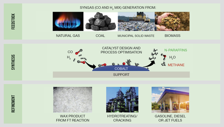 Syngas, a mixture of gaseous hydrogen and carbon monoxide, is used as a source of carbon. Syngas can be generated from various carbon sources, including coal, natural gas, municipal solid waste and biomass. The process mainly produces linear long-chain hydrocarbons. These require a further hydrocracking procedure to break and isomerise them into alkanes with the correct properties for fuel applications. In the quest for sustainable fuel solutions, synthetic fuels promise a cleaner way to power cars, heavy-duty vehicles and planes. The latest developments in Fischer-Tropsch technology mean that the production of fuel from sustainable carbon sources is now closer to being commercially viable at all industrial scales.