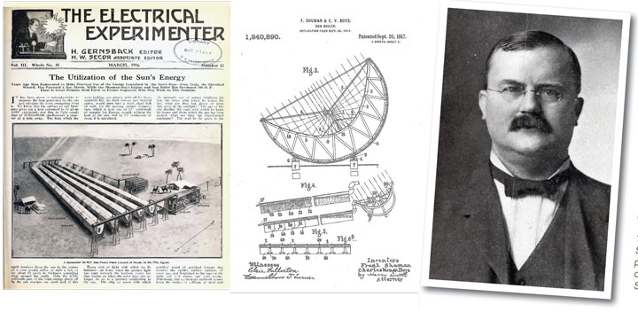 IN EGYPT in 1913 Frank Shuman (1862–1918) constructed a 60 kW solar power unit to drive an electric generator, but for public demonstration purposes, pumped water from the Nile at a rate of 14 t/min to a height of 10 m. Solar power was going to replace most of the coal on which Egypt relied. All that was required was to construct more and larger versions with no new engineering required for fabrication. The technology was proven, economic, and everyone was enthusiastic.
