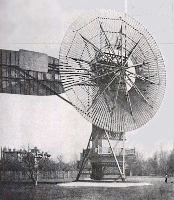 The windmill has been used for more than 1,000 years, for pumping water or grinding materials. The first modern wind turbines for electricity were built at the end of the 19th Century in Scotland, Denmark and the US, the most notable being that in 1888 of US inventor Charles Brush (1849–1929): a 12 kW, 17 m diameter fully automatic unit. He gave up his involvement with electricity in 1891, and the company made no further units.