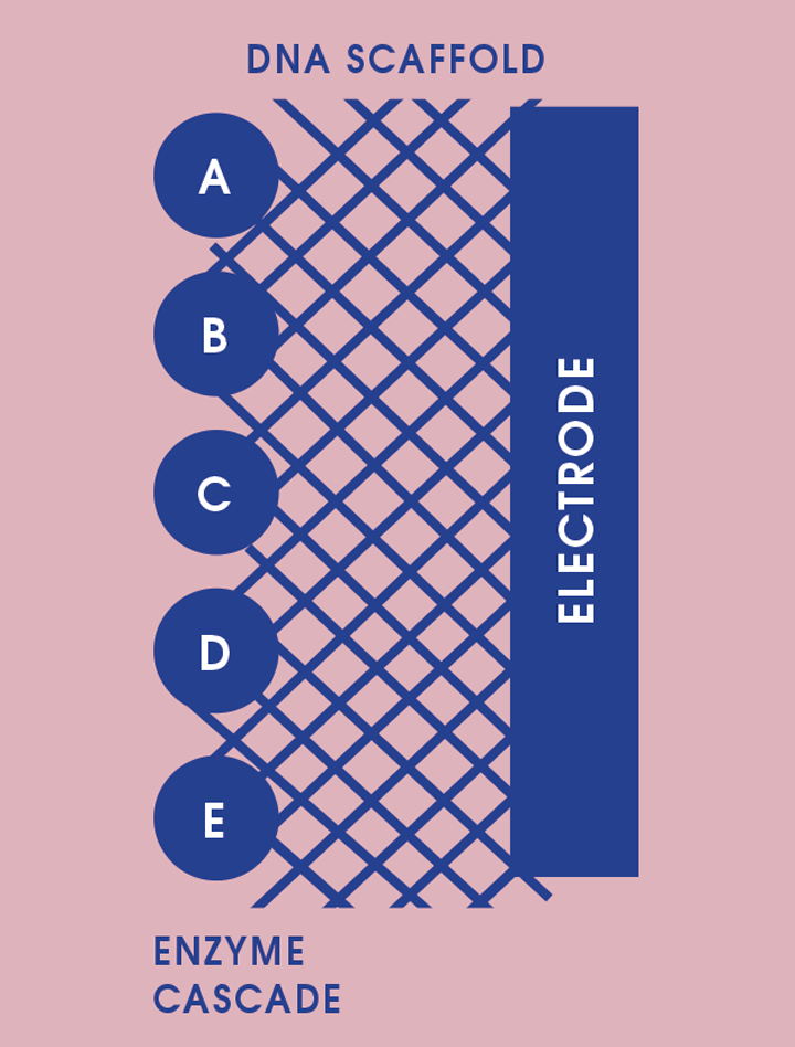 Once the electrons have been produced in the cascade reactions, they are then passed to the electrode via carbon nanotubes which are mixed into the hydrogel phase to make a composite on the electrode surface. Put simply, the DNA scaffold holds the enzymes onto the electrode by wrapping round it.