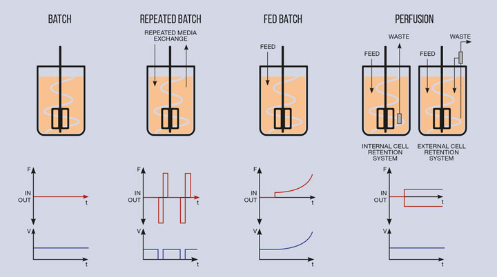Bioreactor feeding strategies have moved away from traditional “batch”, which involved loading all the necessary cells and nutrients together and leaving it to run its course. Fed-batch (where fresh nutrients are periodically added) and perfusion (where fresh nutrients are added and waste materials removed) allow much higher viable cell numbers and therefore much higher product titres per litre of bioreactor volume. This allows a significantly smaller bioreactor to produce the product previously made in a larger system.