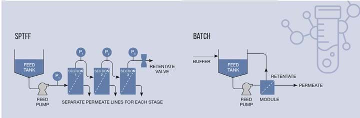 SPTFF does not require the product to be recirculated around the system over and over as the concentration occurs, it simply enters into the filter membranes which are arranged in series. This can be implemented by modifying existing TFF systems with relatively limited costs and many benefits, or by purchasing single-use capsules for even faster turnarounds.