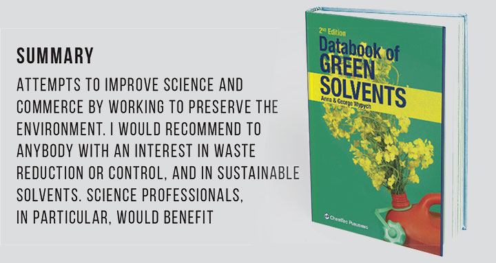 After reading Databook of Green Solvents, I look back at the past 30 years of my career and wish that at times I had access to a publication such as this. Within the chemical industry it is sometimes difficult to isolate key data in a timely fashion, and I feel that this publication fills that void to a significant extent.