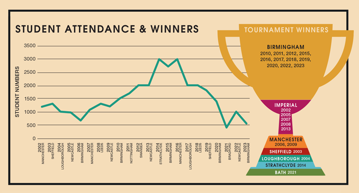 After an already late bid from the University of Sheffield sadly fell through, students from Birmingham took it upon themselves to deliver the event. Having been put together in just three months, Frank Morton 2023 was saved! Birmingham were overall winners again (for an 8th time in the last decade!), but the drop in student attendance was telling (see boxout). Which begs the question: is Frank Morton Sports Day fading away? Has the pandemic resulted in a generational knowledge gap of this incredible event and a general loss of enthusiasm? We certainly hope not. Frank Morton Sports Day is a unique event among the engineering community and its loss would be detrimental to the students who take part and those who gain valuable CV-boosting skills from organising it.