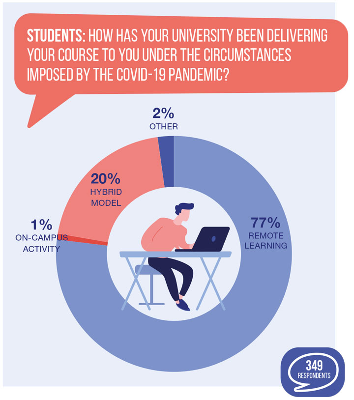 According to our students, remote learning now accounts for the vast majority of how they are educated, with hybrid models (combining remote learning and on-campus activity) presenting a significant portion also.