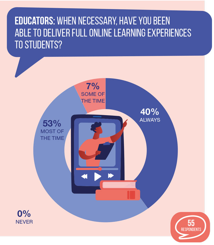 Despite the challenges faced, the majority (51) of educators believe they have been able to deliver full online learning experiences to students over this period, at least “most of the time”.