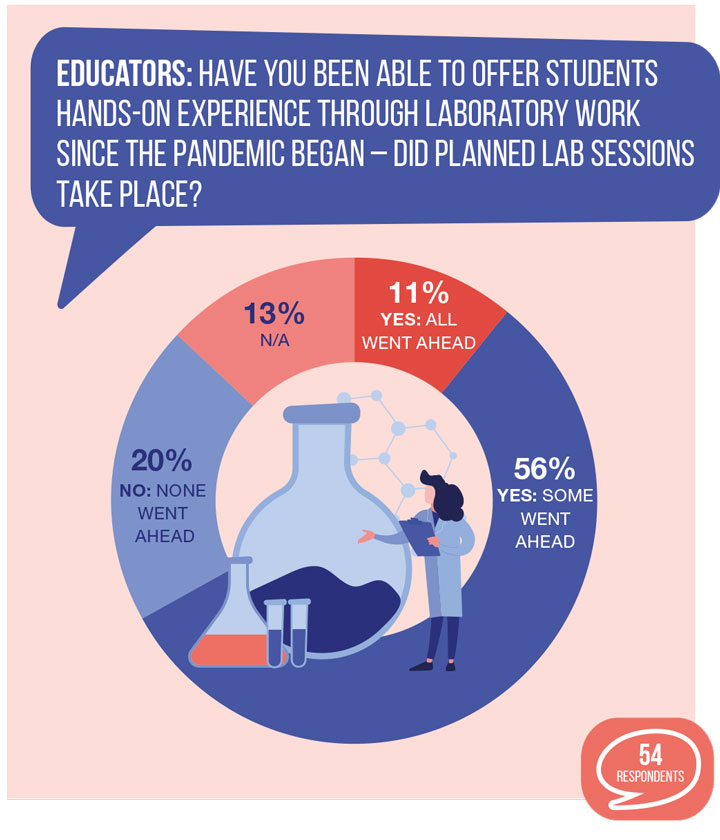 Typically requiring access to on-campus facilities, and involving many students in a single room, some laboratory sessions were not possible during the pandemic, although 11% of educators said that they had been able to allow students to take part in all scheduled laboratory sessions.