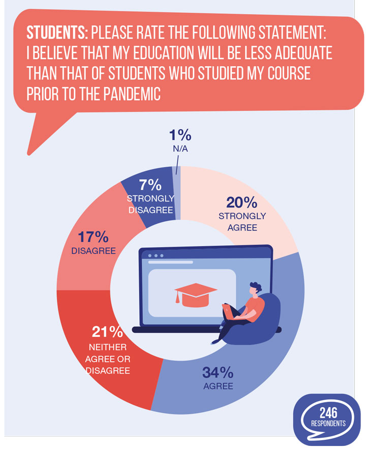 The majority of student respondents believe that their education will be less adequate than those who studied prior to the pandemic, with 20% (49 of 246) and 34%, respectively, saying they “strongly agree” or “agree”.