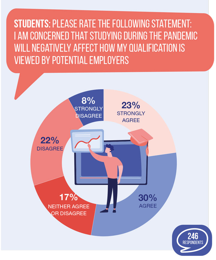 The majority also believed that studying under the pandemic will negatively impact how their qualification is viewed by employers, with 23% and 30% saying they “strongly agree” and “agree” respectively.