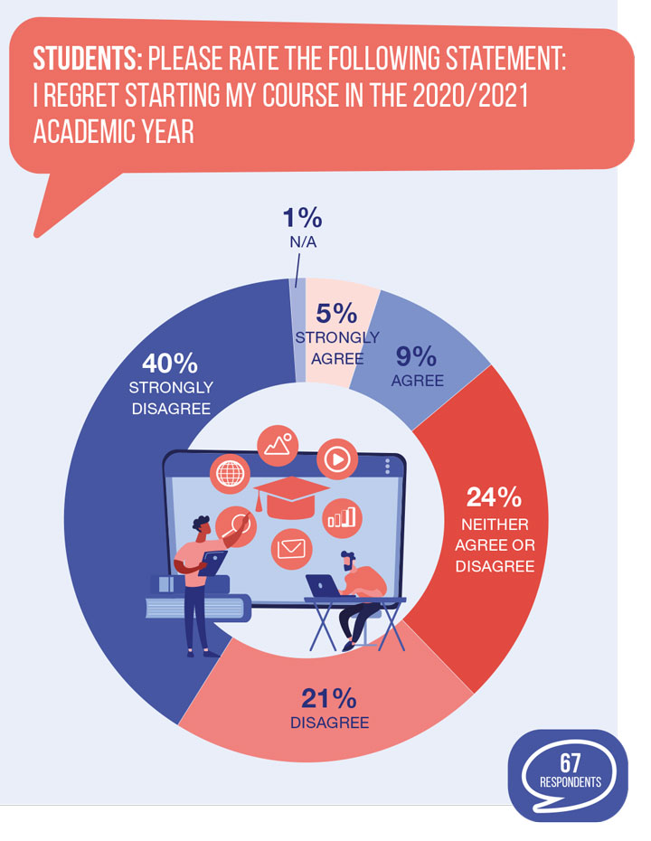 Similar trends of concern are observed in students that began their studies in 2020/2021 (accounting for 72 of total respondents). But, despite this, the majority of first-year students responding (67 respondents) said they did not regret starting their education this year.