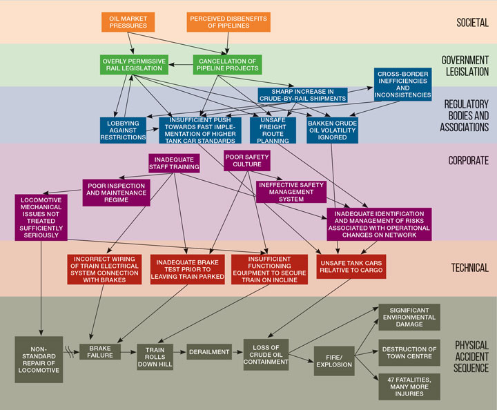 Due to the wide range of factors contributing to the Lac-Mégantic accident, arguably the systems engineering and system safety way of thinking is the most suitable approach for reviewing the accident. A wide range of system safety analysis and visualisation techniques are available to modern-day safety practitioners. For this article, Rasmussen’s AcciMap approach was used (see Figure 1). It is a simple but powerful way of capturing a wide range of causal links for accidents that have already occurred. The following sections discuss some of the contributing factors to the accident.