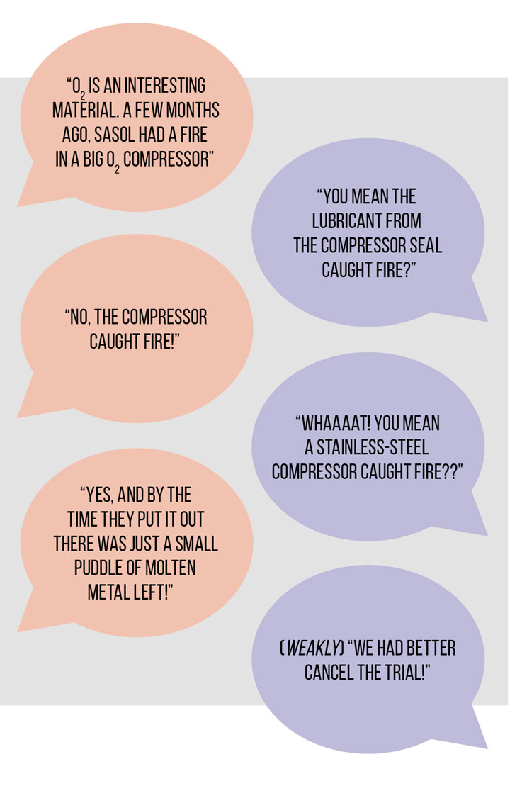 A few months after the compressor incident, a senior salesman from Afrox (part of the Linde Group) came to see me. They were installing a new air separation plant to cater for increased demand for liquid nitrogen for frozen food products. Unfortunately for them, they had no increase in sales of liquid oxygen, so they were trying to find markets for the extra O2 which would be produced.