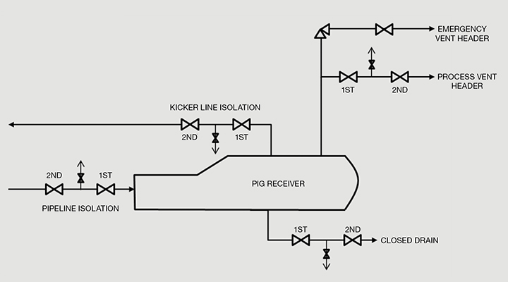 Isolating a pig receiver in preparation for opening the door provides an excellent example to demonstrate the potential difficulties in achieving a suitable isolation. It is universally accepted as a critical activity requiring a high degree of integrity. Figure 1 demonstrates that the receiver will need to be isolated from the pipeline at both its inlet and in its kicker line. Given that the pipeline is likely to be live and possibly at high pressure, there can be no doubt that a proven isolation will be required. A double block and bleed arrangement can be used for this.