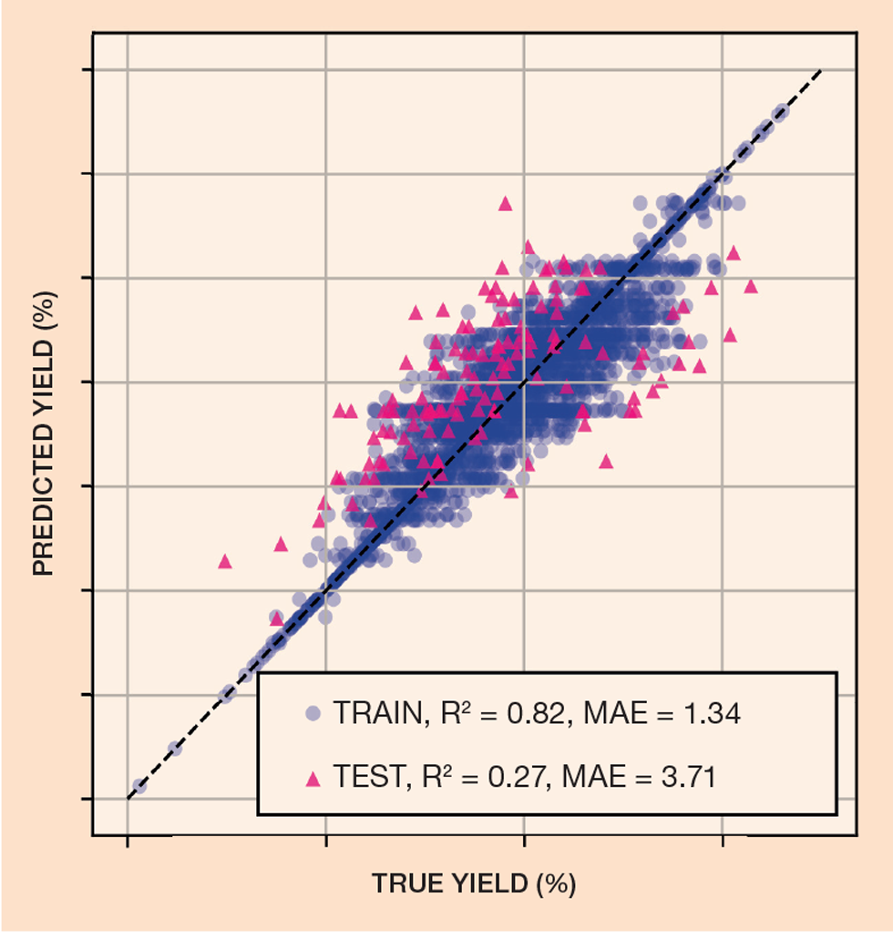 In effect, the variable you are trying to predict is being used, directly or indirectly, to calculate one of the model inputs. We have replicated this by engineering the feature “deviation from target yield”, defined as the difference between the true yield and the target yield for a specific raw material batch. This feature relies on knowing the yield value that the model is supposed to predict, making the resulting model invalid. Unfortunately, mistakes like this are not uncommon.5