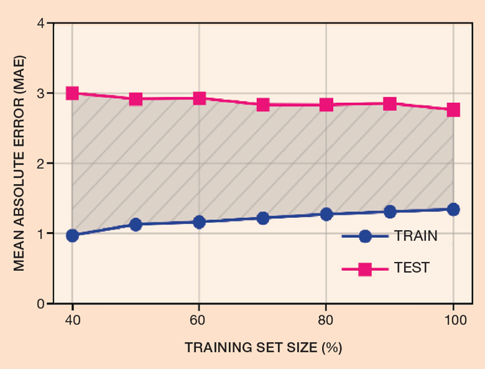 As an extreme example of a model which has not avoided these traps, consider a model which predicts product yield across a continuous fixed-bed reactor using the mean reactor temperature and pressure, the H2 feed ratio, residence time and the raw material batch number. If we assess the parity plot and scores (see Figure 2), the training scores are pretty good (R2=0.82). However, when we review the performance on the unseen data, the performance is far worse (R2=0.27). We can see through the learning curve (see Figure 3) that the gap between the model scores has slightly improved with more data, but the training error is significantly lower than the test error.