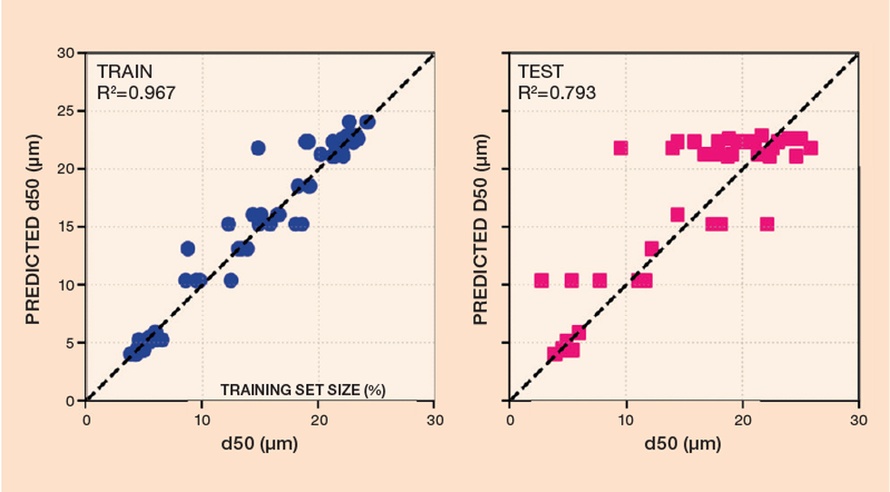 This second example highlights the importance of proper performance appraisal and assessing model generalisability. The model was trained to predict product particle size (d50) from a mill, yet the test results show clear clustering (see Figure 4), rendering the model unfit for any decision-making. Robust appraisal and optimisation would have identified these issues early on. In our opinion, the only thing worse than a poor performing model, is one that you think performs well, but in fact generalises disastrously.