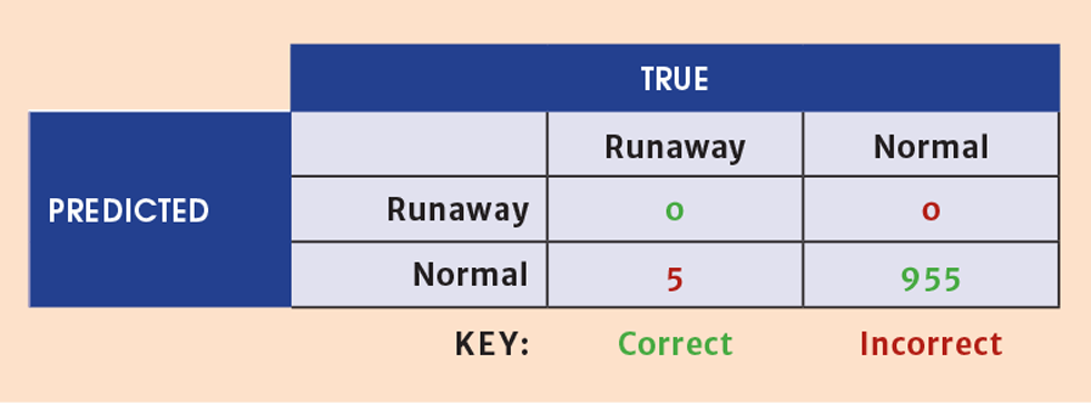 A common example is using “accuracy” on an imbalanced classification task when we care about all classes equally. Imagine you were training a classification model on a reactor dataset, aiming to classify when you are at risk of thermal runaway in your vessel. Would you be happy with an accuracy of 99.5%? You probably shouldn’t be! In Figure 5, the model constantly predicts “Normal Operation”. Accuracy would mostly reflect the model performance at classifying the dominant class with the most samples (“Normal Op”), giving very little importance to the infrequent but vital thermal runaway class. Since it is critical to detect runaways, a much better choice of metric would be one that emphasises detection of runaway, albeit at the cost of increased false positives. Thinking your reactor might blow up when it is actually safe is a better option than believing you are in a safe operating mode when you aren’t.