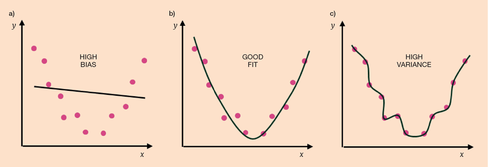 Underfitting and overfitting are illustrated in Figure 6 a) and c), respectively. The optimal balance between bias and variance results in a model that is neither overfitted nor underfitted; capturing the underlying trend in the data and rejecting noise, Figure 6 b).