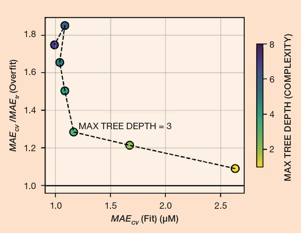 The difference or ratio between the two scores indicates the “generalisation gap”, or the extent of overfit. A plot we use for assessing the fit vs overfit trade-off is one which we first saw from Barry Wise at Eigenvector.1 Referring to the same project as Figure 4, predicting the d50 of milled powder, Figure 8 shows model overfit, quantified as the ratio of the training score relative to the validation score on the y-axis, and the fit on the x-axis is simply the validation score. The colour indicates the maximum tree depth of the different random forest models. As the model becomes more complex, the fit improves at the cost of small increases in the overfit. At a depth greater than 3, the overfit ratio begins to increase significantly. The optimal region is the bottom left but specifically which model you select depends on your acceptable trade-off.