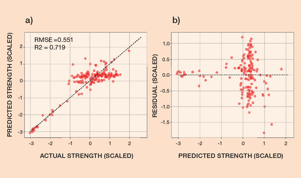 While validation and testing scores are critical and ratios of training to testing or validation scores are useful diagnostics, visual assessment of model fit, predictions and residuals is often more informative and intuitive. As an example, we trained a regression model to predict the hardness of catalyst pellets from process variables measured by the pelleting machine sensors.2 Predictions on a holdout test set are shown in Figure 9. The test R² score is 0.72 and the RMSE is 0.55 for data ranging from −3 to 2, suggesting reasonable predictive performance. However, visual inspection reveals strong heteroscedasticity in the residuals; that is, the error magnitude varies systematically across the prediction range. The model discriminates well between very low-strength pellets and the remainder but performs poorly when distinguishing between medium- and high-strength pellets. A contributing factor here is the reliability of the strength measurements themselves, which are known to have a ±30% margin of error.3