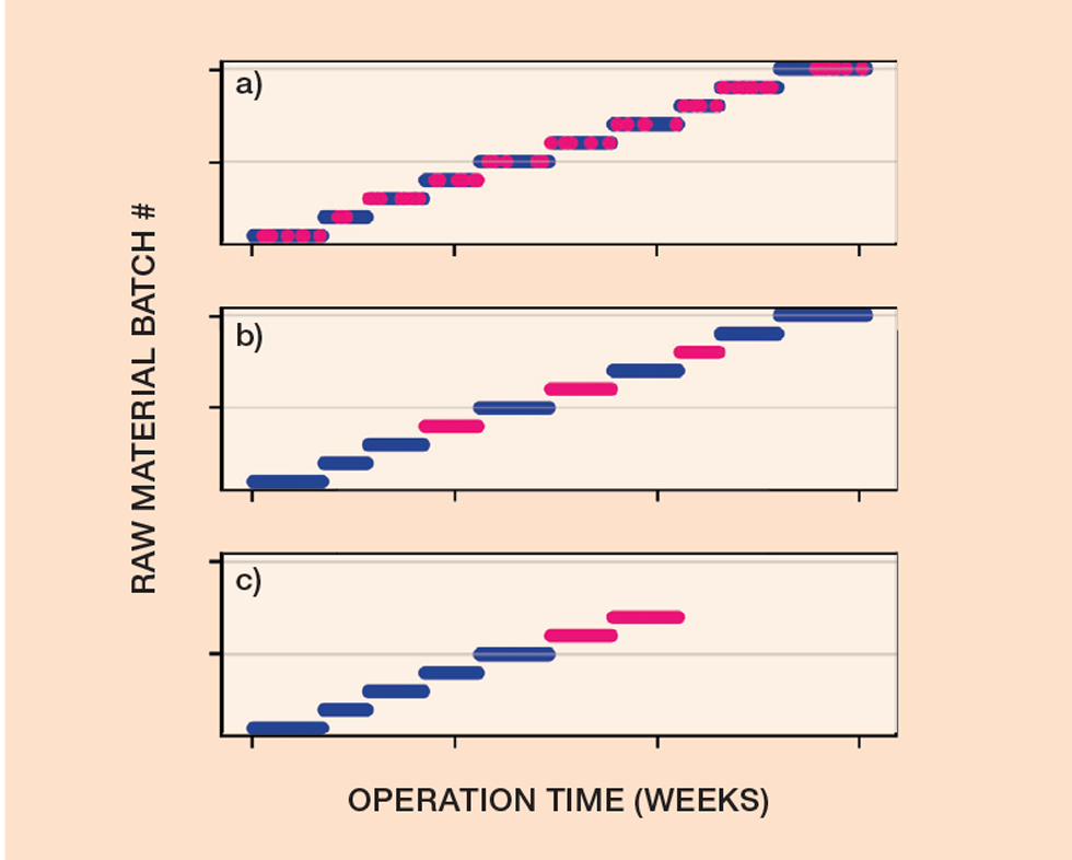 Test contamination can occur through explicit duplication of samples, or more subtly through improper data splitting. To illustrate, suppose we add 5% duplicate rows with slight noise in the yield. These duplicates are present in both training and test data, so the model will have memorised them when tested. Alternatively, say you want to predict reactor yield for new raw material batches, where the inter-batch variability affects the reactor performance. Your data-splitting strategy must reflect that, testing under those conditions. The incorrect approach would be to do a typical random splitting of the data into training and testing, ignoring the raw material batch number. A given batch thus appears in both training and testing sets: Figure 11 a). Information about the test batches has been leaked into the training data. The correct approach would be to maintain batch integrity when splitting, Figure 11 b), enabling genuine predictivity testing of unseen batches, or to the prediction of future batches, Figure 11 c).