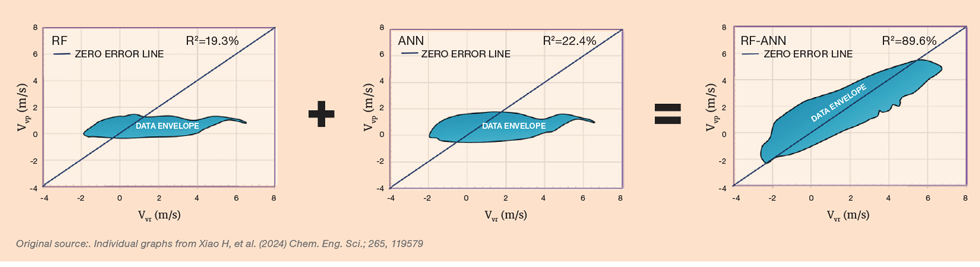 The above examples used synthetic data, but there is no shortage of real examples in the literature: there is a “leakage and the reproducibility crisis”. In a published example where there is open correspondence, the authors use the “stacking” in series of two ML regression models, each with an R2 in the order of 20%, to generate an ensemble model with an R2 of 90%6 graphically represented in Figure 13. Given that the two constituent models individually give essentially no fit, this is a surprising result.
