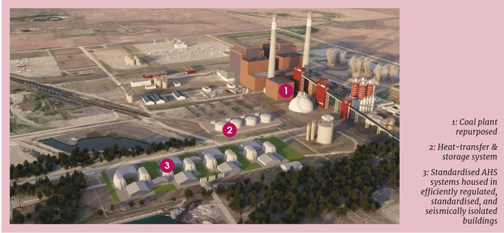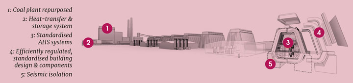 MIT has developed a heat storage and transfer system based on the use of molten salt coolants so that the nuclear reactor is decoupled from the rest of the power station. The reactor generates heat which enters the heat transfer system, and this system then raises the steam that drives the turbine. The system acts like an adaptor, meaning that the turbine and generator don’t have to be designed to nuclear standards and that the existing equipment in the coal-fired plant can still be used. Reusing a significant proportion of the existing facilities reduces the cost by around 40%.