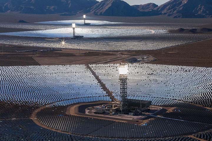 Next, lagging way behind with around 22 GWh is concentrated solar power. An array of technologies are available but typically this involves using mirrors to focus sunlight onto a receiver tower to heat the fluids cycling inside. A common example is molten salts which can be stored in tanks and then passed through a heat exchanger to generate steam for use as process heat for industry or a turbine for power. This allows solar to provide energy even during the night, though application of the technology is limited to very sunny countries, and plants have very large footprints.