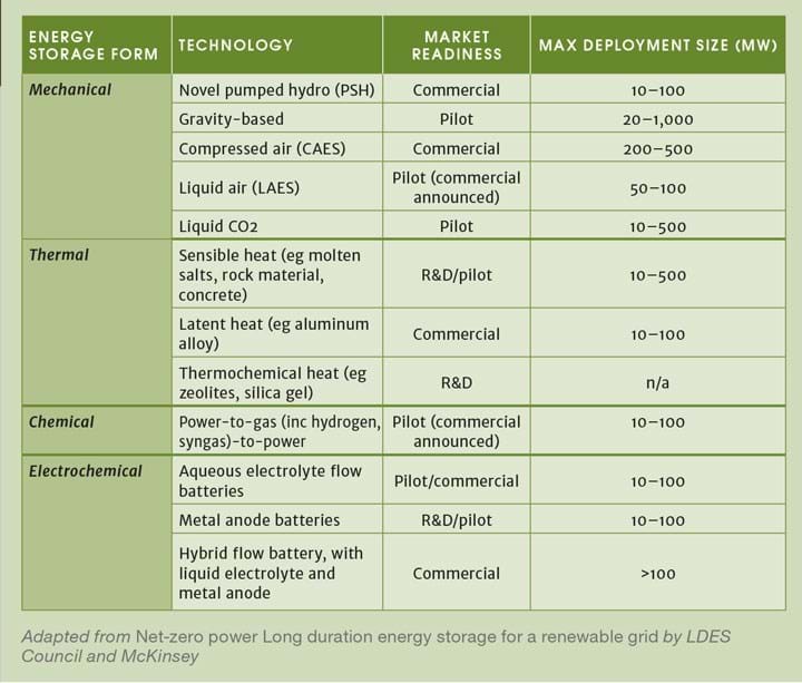 In November, industry and technology developers including BP, Rio Tinto, Alfa Laval and Microsoft formed the Long Duration Energy Storage Council and set a target to help deploy 85-140 TWh of energy storage by 2040. A report by the group outlined the market readiness of some of the more nascent technologies (see Table 1). Let’s look at a selection of projects that are currently in the works.
