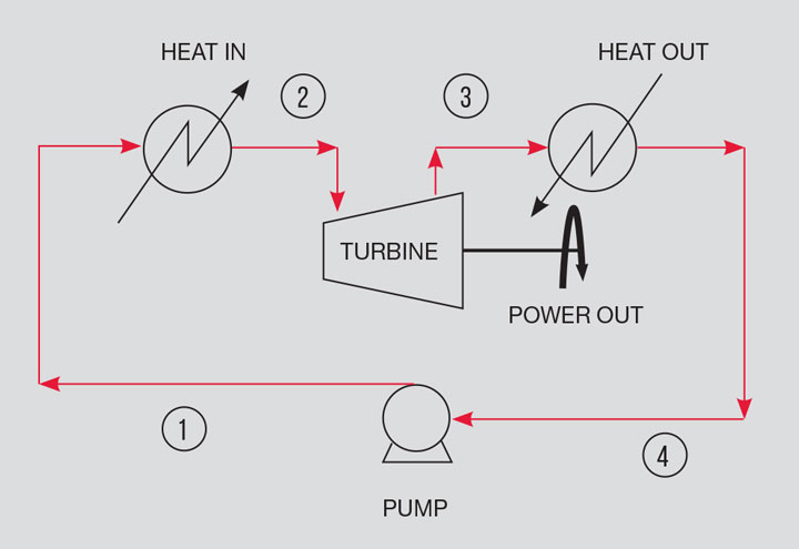 The Rankine cycle makes use of a temperature difference to generate power. The ideal cycle is in four parts. The hot source is used to vapourise a liquid at constant pressure. The vapour is used to drive a turbine to isentropically extract work. The vapour is condensed to a liquid utilising the cold fluid at constant pressure. The liquid is returned to the vapouriser using a pump. It is the principle adopted in heat recovery steam generation systems in combined cycle power stations.