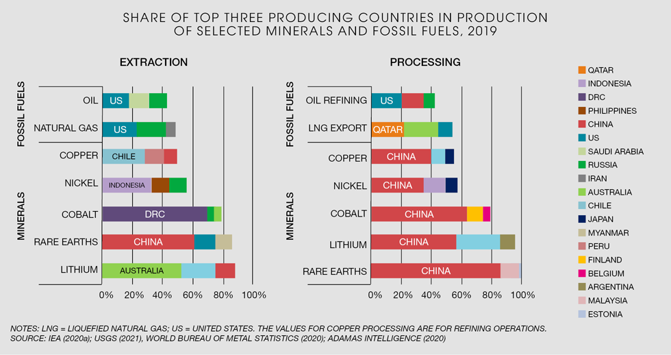 The third chart shows that, while extraction is global, we are heavily dependent upon China for the mineral processing.