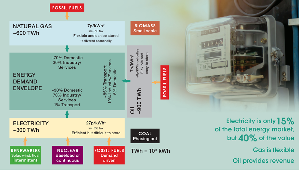 There are three primary vectors; oil, meeting half of our total energy demand, primarily for transport; natural gas, meeting a third of demand, primarily for heating on a seasonal basis; and electricity. The latter is significantly more expensive and only provides one-sixth of today’s energy and is produced to demand as it cannot be stored easily. Traditionally generated from coal, then oil, and latterly from natural gas and nuclear, electricity is increasingly produced from renewables at lower cost but delivered on an intermittent basis. Demand has dropped over the last two decades as we have improved energy efficiency and outsourced much of our industry. This trend will reverse as we deploy efficient and cleaner technologies such as heat pumps and electric vehicles (EVs), adding seasonal demand and requiring major expansions of our power grid.