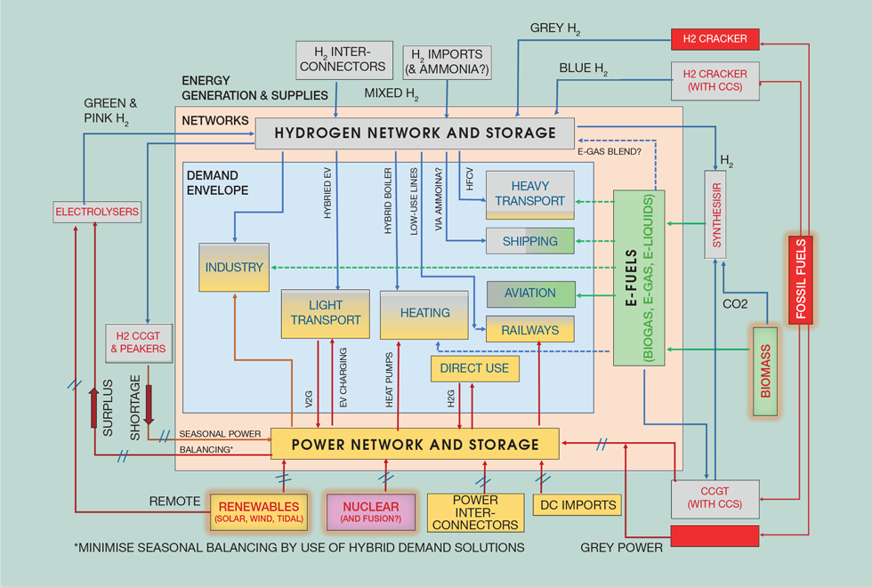 I believe the future energy schematic that I have proposed will help us systems engineer net zero. I also hope it provides a clearer picture of how we can get electricity, hydrogen, and e-fuels working together to realise lower costs for consumers and cancel out the “stings in the tails” of renewables, heat pumps, and EVs by balancing demand both inside and outside the demand envelope.