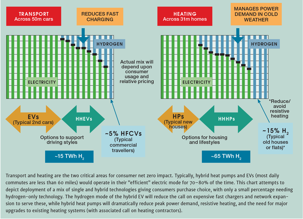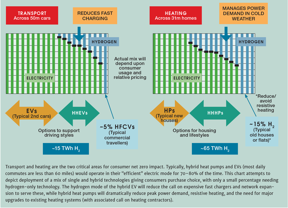 The silver bullets for the consumer transition, EVs and heat pumps, are far from certain. As I discussed in earlier features, these technologies require consumers to make significant changes to their lifestyles and carry “stings in their tails”, stressing power networks at peak times. Consequently, along with measures to reduce demand and the impact of base technologies, I have proposed deployment of hybrid alternatives, combining the efficiency of electricity with the flexibility of hydrogen, giving consumers more choice and reducing the call on resources such as rare metals and lithium. A hydrogen hybrid heat pump has been demonstrated in Wales, while Renault and others have prototype hydrogen hybrid cars. Figure 3 helps explain how hybrid solutions could be included in the future technology mix.