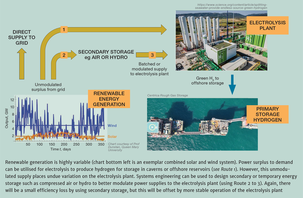 We are already network constrained on some windy days, and, as the percentage of renewables gets closer to 100%, surpluses will increase but they can be used to produce green hydrogen at low cost. This is where system engineering can really come to the fore, as we must find economical solutions. The hydrogen cycle is inefficient, but it will be driven by differential electricity pricing (ie low prices at times of excess generation to higher prices at times of shortfall). And, while there will be an overarching summer to winter spread, wind energy varies hour by hour, and these shorter variations will impact the operation of electrolysis facilities, further reducing viability. See Figure 4 for an example of how systems engineering can help increase the efficiency of electrolysis operations.