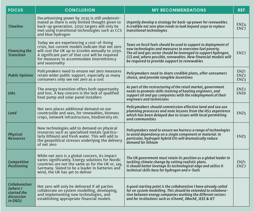 My Engineering Net Zero journey has addressed the overall timeline, financing the transition, managing public opinion, impact on jobs, considerations for land use and physical resources, international competitive positioning, and, finally, the need for that collaboration, and further conclusions and recommendations are summarised below.