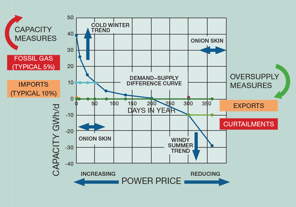 Like the LDC, the LDDC can be used to scope measures needed to balance the system. Short-duration measures should be able to balance the system much of the year, typically days 90–270 on the stacked LDDC. The 15–20% challenge is represented by the outer edges of the LDDC, with capacity measures on the left (typically days 1–90) and oversupply measures on the right (days 270–365). The area under the curve on the capacity measures side is the annual balancing load or required stored energy, which by 2050 will be that forecasted 80–100 TWh. The chart also shows the trend of variable pricing, increasing when capacity measures are in operation and dropping significantly at times of oversupply. Further, the LDDC can present design cases for cold winters and windy summers.