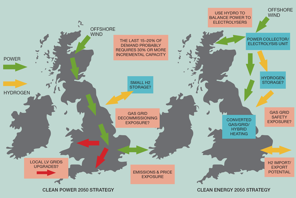 The Clean Energy 2050 scenario, represented in Figure 7, reduces both peak power demand and exports, and will decarbonise our total energy stsyem. In turn, HV and LV grid infrastructure does not have to be oversized, minimising pylons and local disruption, and cuts back on copper usage. Development of offshore power hubs, equipped with electrolysers, would allow green hydrogen to be piped directly to offshore storage, while power can be collected and routed offshore to English markets, minimising overland transmission. With hydrogen likely becoming an international commodity, larger offshore storage facilities would also allow the UK to benefit from timely imports to offset harsh winters. Clearly, the alternative relies on conversion of the gas grid to hydrogen service, and critics look to transmission inefficiencies and the safety of hydrogen. In terms of energy equivalents, hydrogen use in hybrid heating will be less than a quarter of that today for natural gas and so, despite its lower calorific value, the transmission inefficiencies can be managed. Meanwhile, the Health & Safety Executive5 and others are addressing safety concerns as part of their ongoing work assessing hydrogen’s role in heating. Finally, coming back to that heat pump example, a 10 kW hybrid heat pump will only require the first 10 kW of generation capacity, as the back-up is provided by the gas grid.