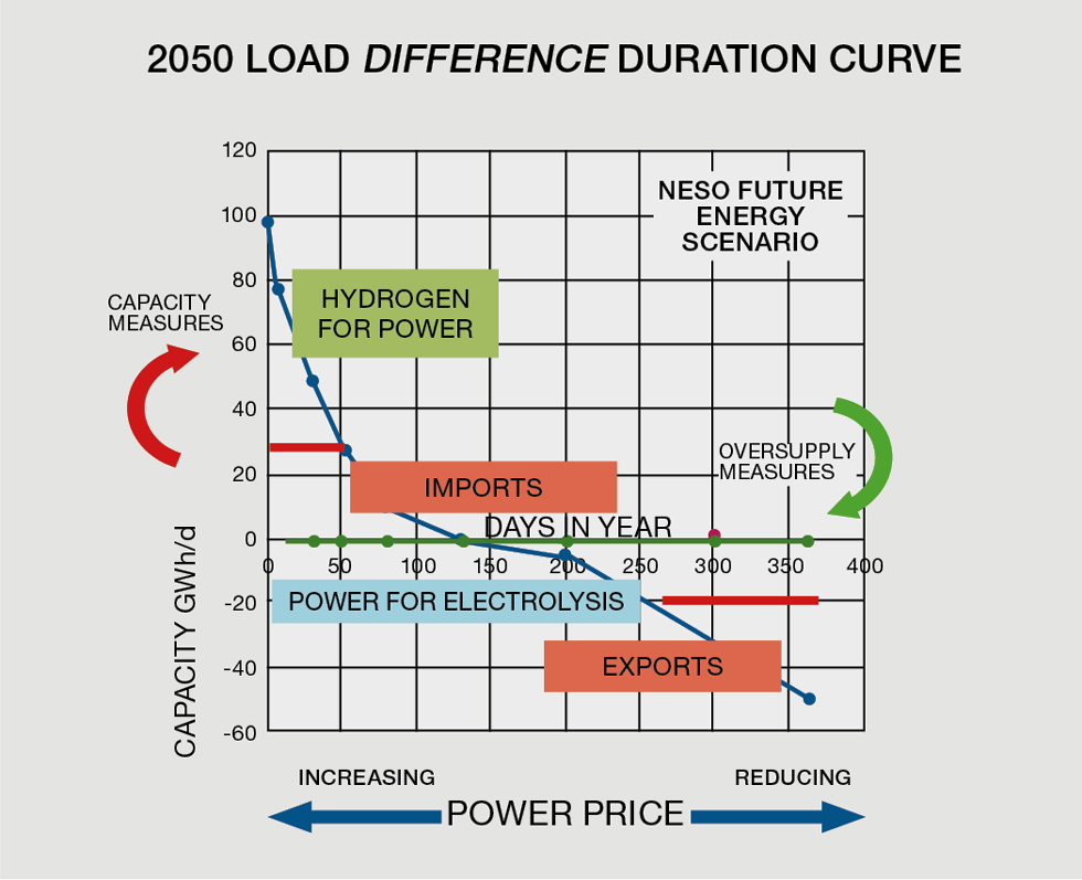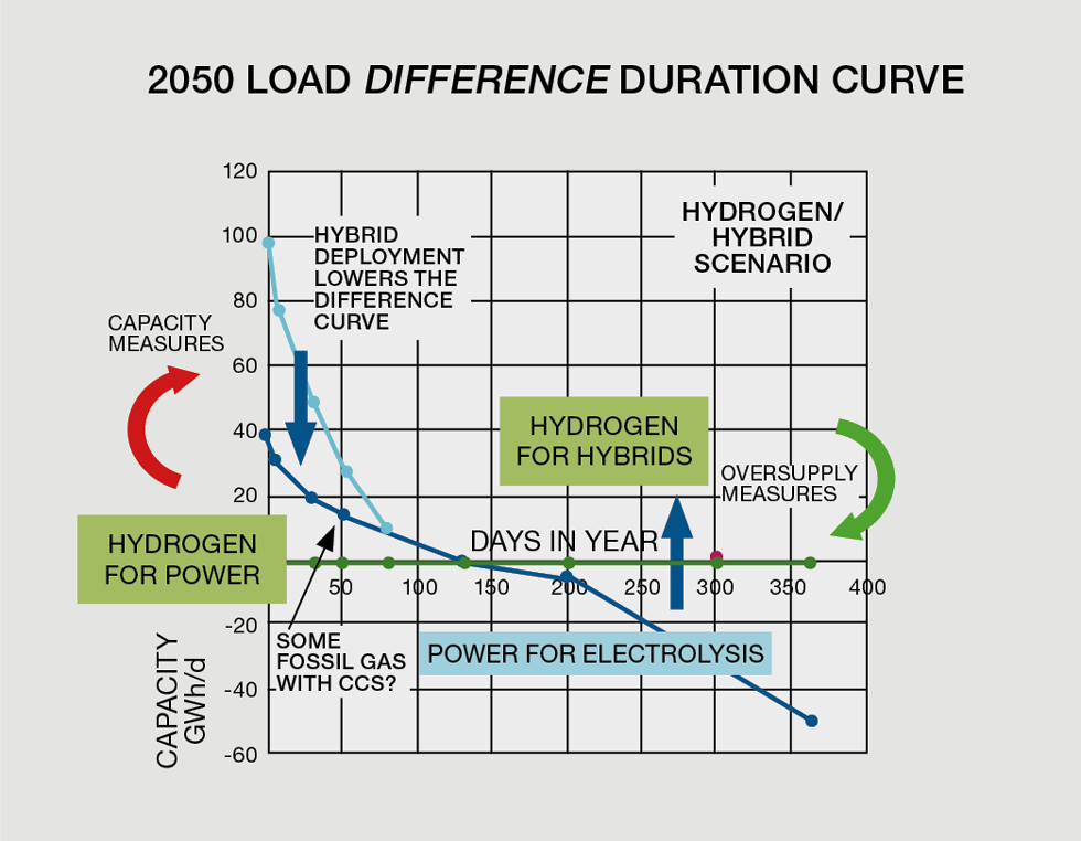 With hybrid heating, hydrogen is used directly to offset peak power demand, and becomes a long-duration DSR measure, significantly reducing the need for power grid upgrades, but, more importantly for consumers, it will reduce heat pump installation and running costs. The impact of hybrids can also be shown on a LDDC as presented here with hybrids reducing the level of the difference curve and the quantum of stored power.
