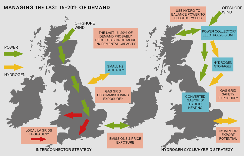 The chart captures some of the key considerations for two options which although based upon similar development of renewables result in very different infrastructure requirements. Many of those considerations have already been discussed in this series, but some pertinent summary points are considered below: