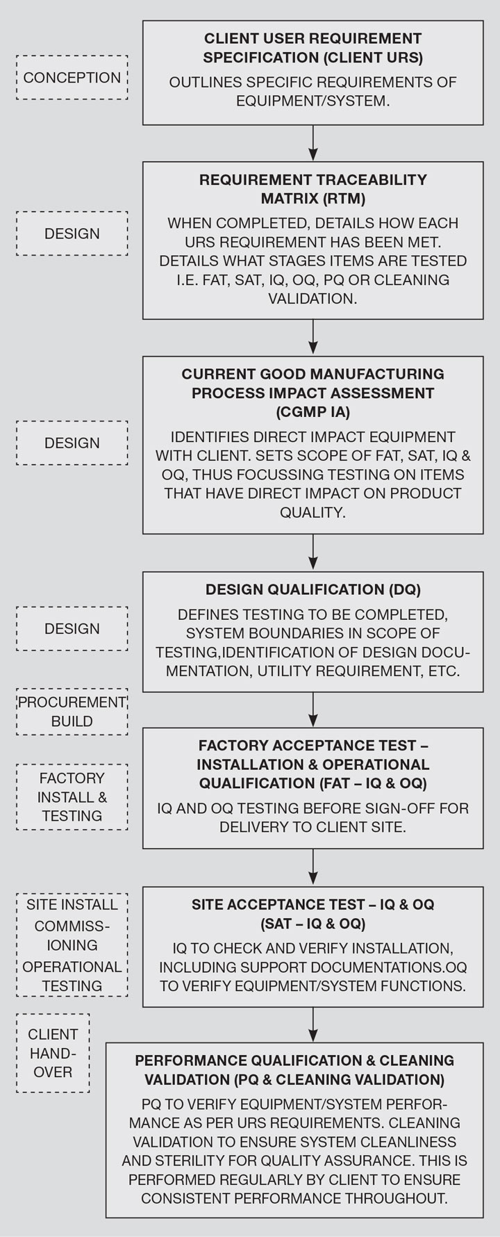 Figure 1 presents the typical qualification process for a pharmaceutical project: user requirement specification (URS); requirement traceability matrix (RTM); impact assessment (IA); design qualification (DQ); factory acceptance test (FAT); site acceptance test (SAT); installation qualification (IQ); operational qualification (OQ); performance qualification (PQ); and cleaning validation. Figure 1 contains a brief explanation of each step, alongside its relationship with the development of an engineering project. Once the conception process and client URS are completed, we can begin our design by considering the following topics.